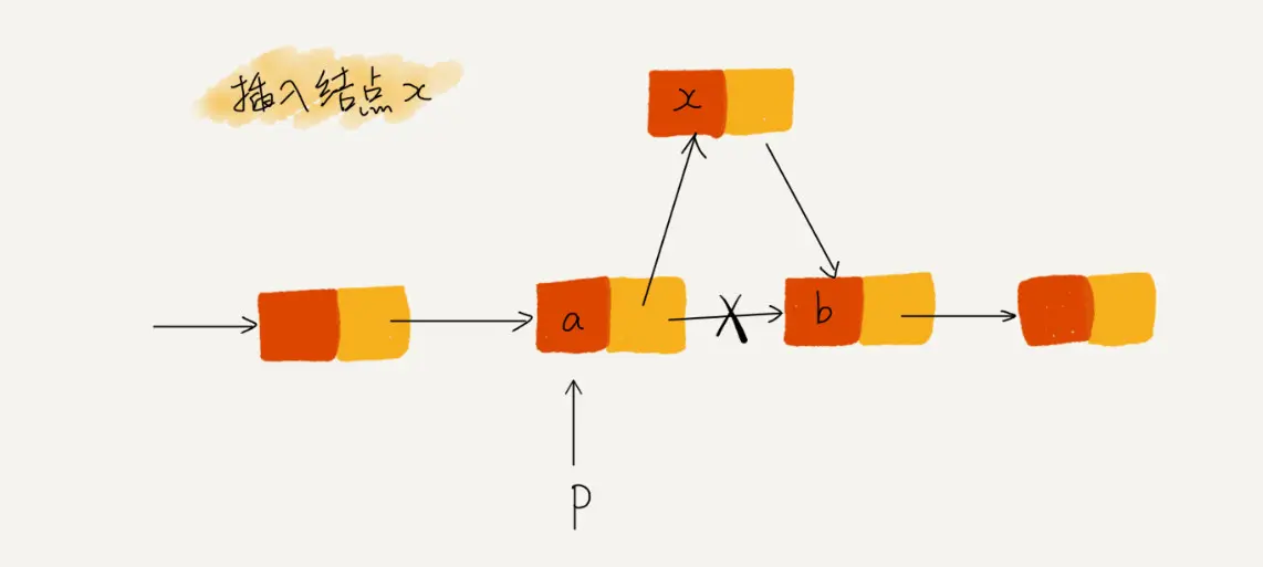 如图所示,我们希望在结点 a 和相邻的结点 b 之间插入结点 x,假设当前指针 p 指向结点 a。如果我们将代码实现变成下面这个样子,就会发生指针丢失和内存泄露。