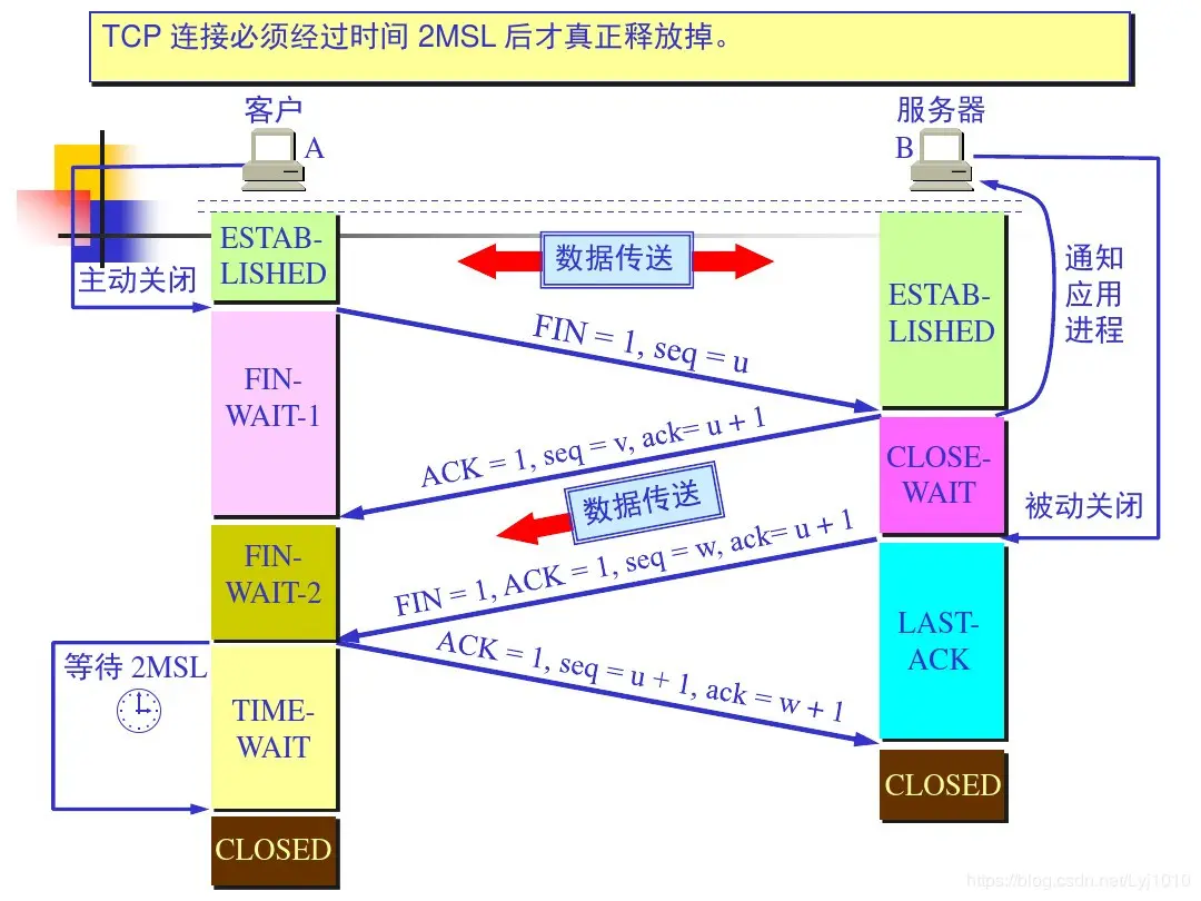 第四次握手:客户端 在收到 服务器 的连接释放报文段后,必须对此发出确认。在确认报文段中把 ACK 置 1,确认号 ack = w + 1,而自己的序号是 seq = u + 1(根据 TCP 标准,前面发送过的 FIN 报文段要消耗一个序号)。然后进入到 TIME-WAIT(时间等待) 状态。请注意,TCP 连接现在还没有释放掉。必须经过 时间等待计时器(TIME-WAIT)设置的时间 2MSL 后,客户端 才进入到 CLOSED 状态。时间 MSL 叫做 最长报文段寿命,RFC 793 建议设为 2 分钟。