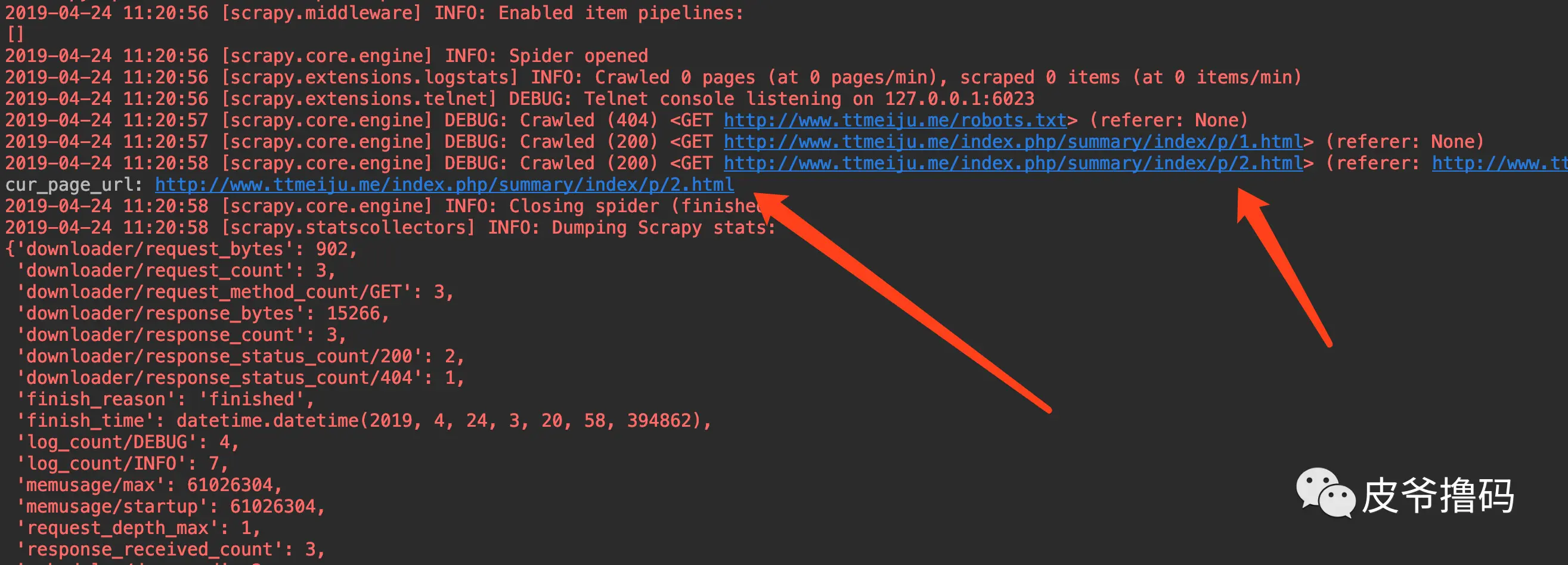 我们看到,去掉follow之后,果然只是爬取两页内容,但是这里 parse_item() 只打印出来第二页的 URL,第一页的URL没有打印出来。这其中的过程在这里简单说一下: