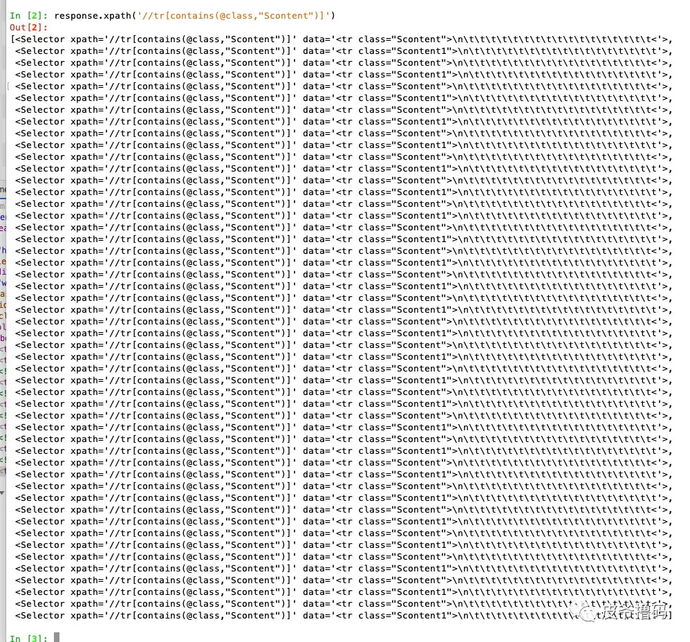 def parse_item(self, response): tr_list = response.xpath('//tr[contains(@class, "Scontent")]').extract() for content in tr_list: selector = Selector(text=content) name = selector.xpath('//td[@align="left"]//a/text()').extract() print(name)