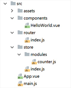 其中,store是我们进行Vuex仓库开发的工作目录;store/index.js是仓库的输出文件;store/modules目录用于放置各个模块;store/modules/counter.js文件是一个加数器模块。 store/modules/counter.js中的代码如下:
