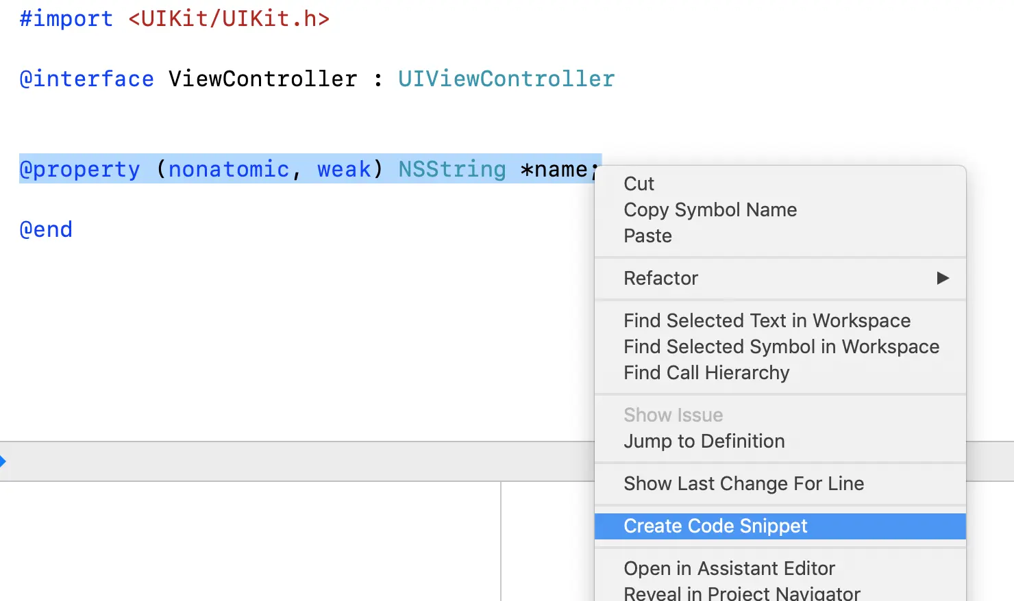 创建一个代码片段很简单,在.h或者点.m文件中编写一段想要作为代码片段使用的代码,例如定义一个变量的的代码片段