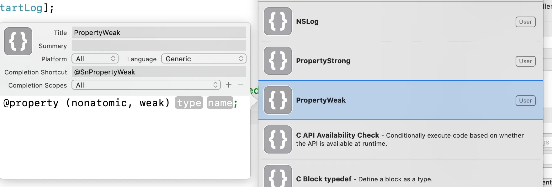 Completion Shortcut:使用时的快捷方式,此处例子中写@SnPrppertyWeak表示Snippet Property Weak,即一个用于写weak property的代码块,使用时只要写@SnPrppertyWeak就可以通过自动补全快速写出。此处使用@开头是为了避免在使用过程中代码片段的缩写开头跟工程中的一些变量同名或者同开头,省去选择的步骤,而sn开头也是表示这是一个代码片段,这样就三个字符就可以使得调用代码片段时不会出现其他不相干的带选项,降低效率。这是个人的习惯思路,每个人都可根据自己的习惯想法去编写。