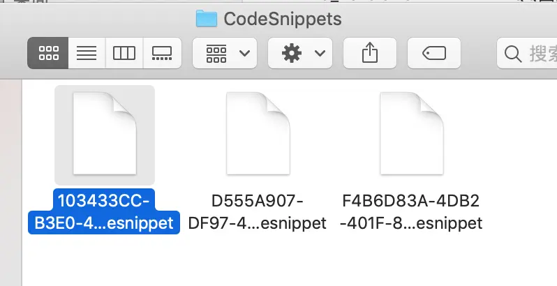 Code Snippet Library 的文件目录是 ~/Library/Developer/Xcode/UserData/CodeSnippets 前往该文件目录可以查看到我们所创建的Snippet,一个代码片对分别对应一个文件。