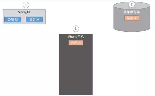 苹果自己有固定的一对公私钥,跟之前App Store原理一样,私钥在苹果后台,公钥在每个iOS系统中.这里称为公钥A , 私钥A. A=Apple