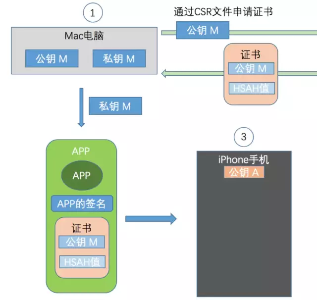 在开发时,编译完一个 APP 后,用本地的私钥 M(今后你导出的P12) 对这个 APP 进行签名,同时把第三步得到的证书一起打包进 APP 里,安装到手机上。