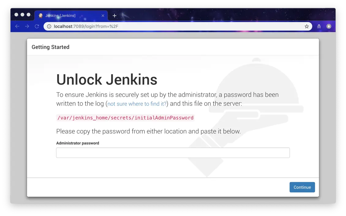 这时,将 jenkins-a 日志中的解锁密码(Unlock password)输入到 jenkins-b 的页面中,会得到报错信息: