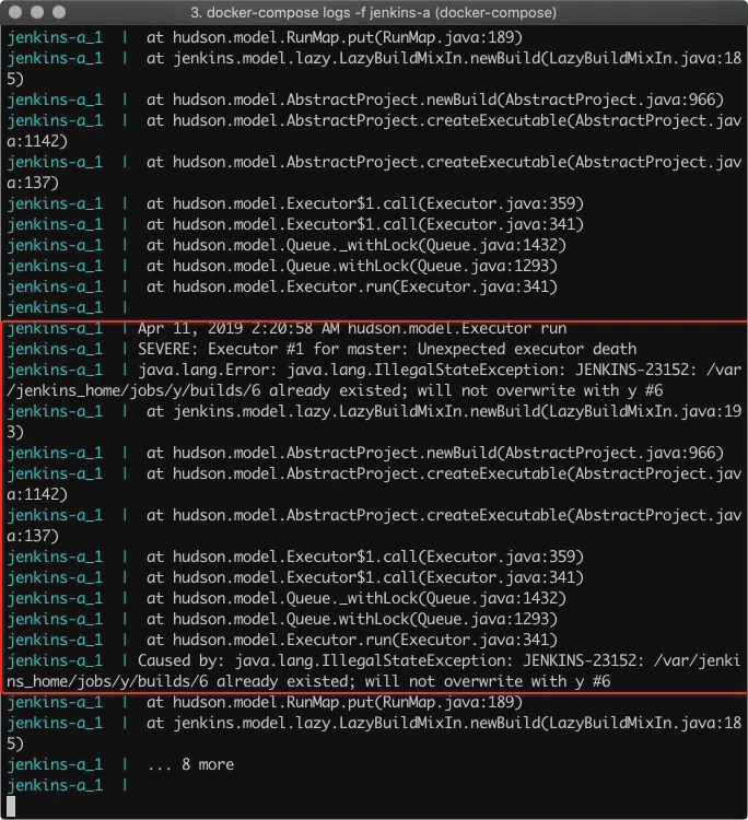 jenkins-b_1 | java.lang.IllegalStateException: JENKINS-23152: /var/jenkins_home/jobs/x/builds/2 already existed; will not overwrite with x #2
