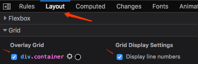 分割grid内行和列的线。 打开火狐开发者版的开发者工具更直观点。将需要调试的grid 容器勾上,右边勾选上显示分割线数字。