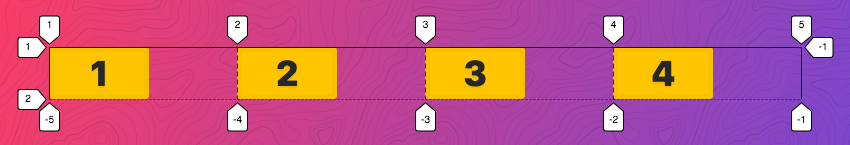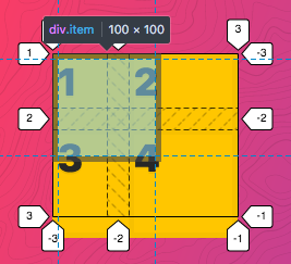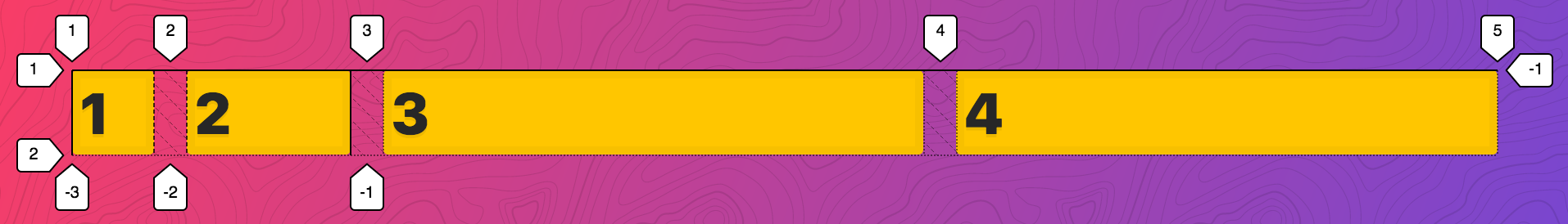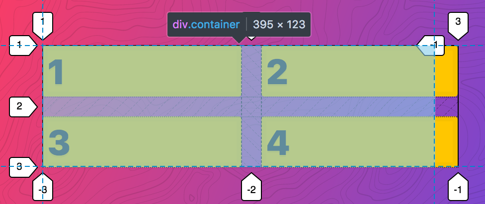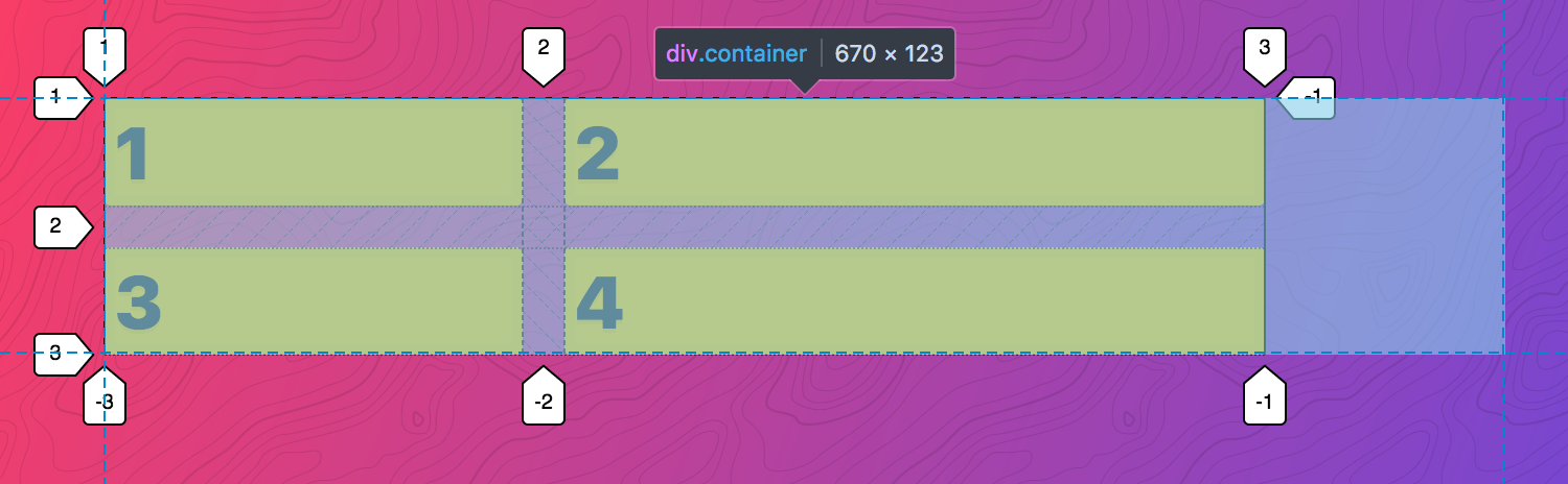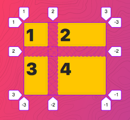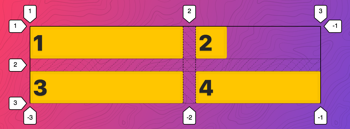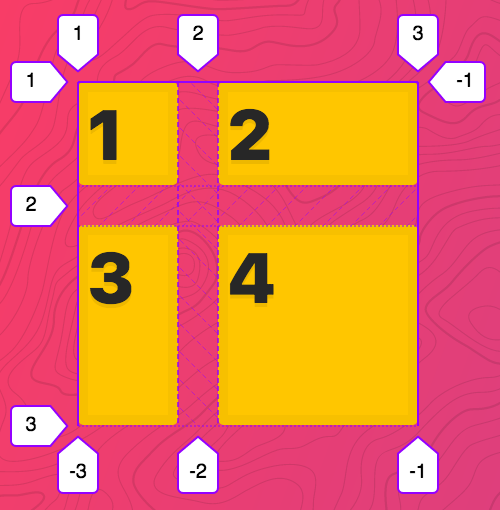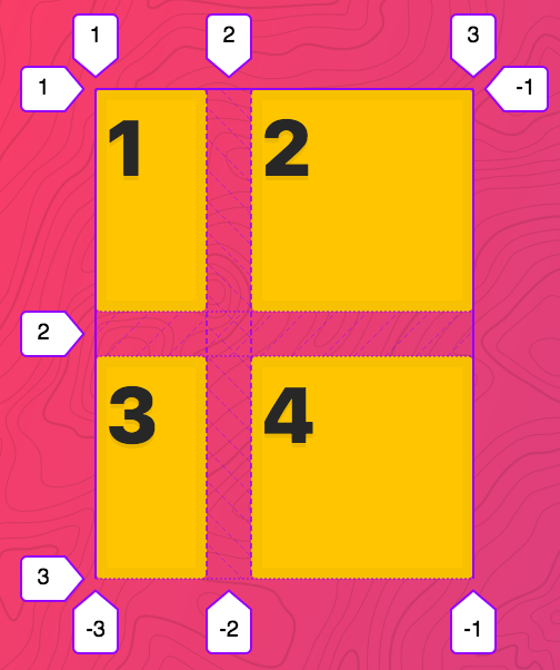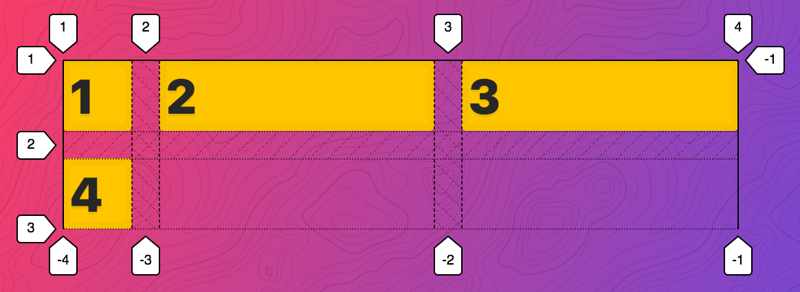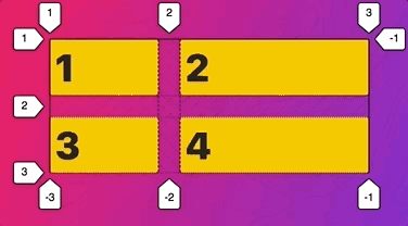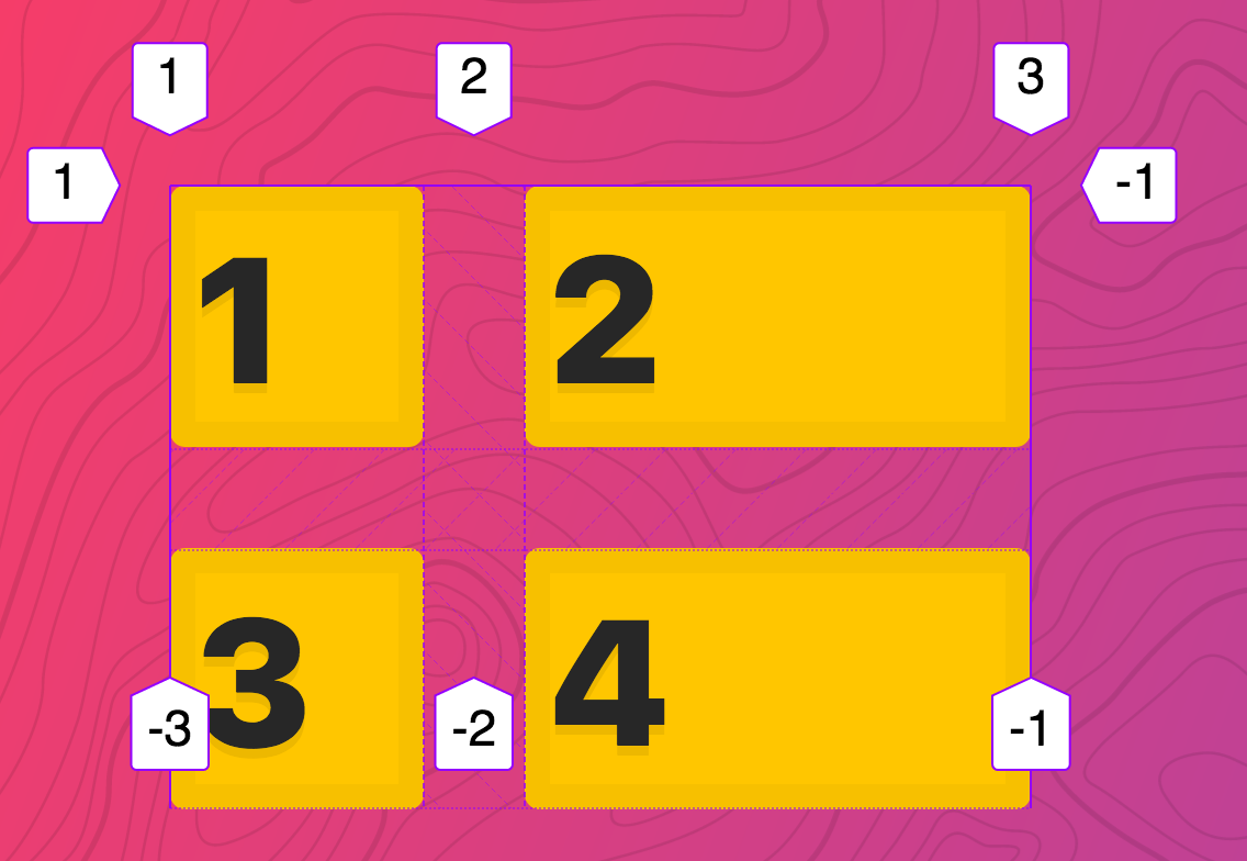 grid-template-columns定义列。grid-template-rows定义行。grid-gap定义列行之间的间隔。- 分割线纵向有3条,横向同样有3条。每条分割线的数字标示可以有正数和负数,-1 表示最后一条线。