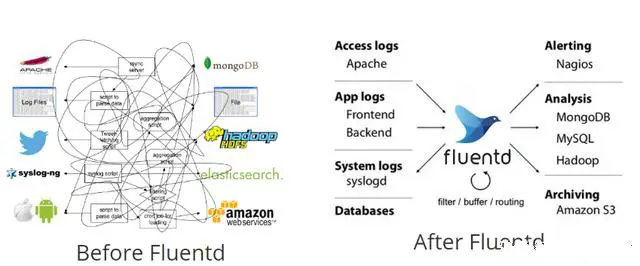 Fluentd 在日志的数据源和目标存储各种各样时非常合适,因为它有很多插件。而且,如果大多数数据源都是自定义的应用,所以可以发现用 fluentd 的库要比将日志库与其他传输工具结合起来要容易很多。特别是在我们的应用是多种语言编写的时候,即我们使用了多种日志库,日志的行为也不太一样。
