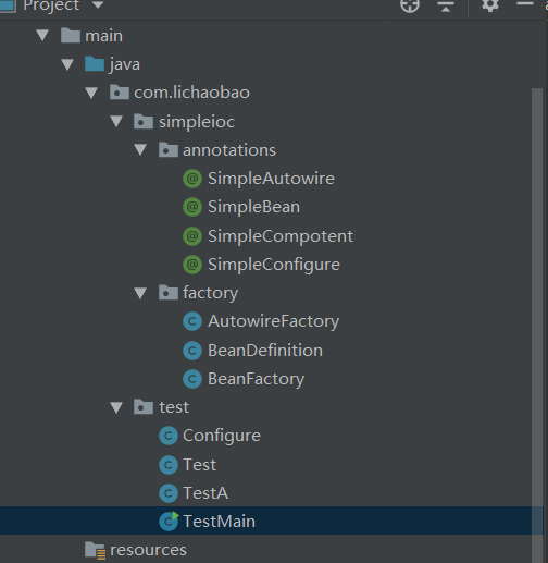 在代码中,有几个注解类,SimpleAutowire、SimpleBean、SimpleCompotent以及SimpleConfigure。他们是按照Spring的Bean、Autowire、Compotent、Configure的简单实现。目前SimpleIOC 只支持单例bean。可以根据自定义的beanName进行bean的生成以及注入,亦可以根据默认的类的全限定名进行bean的实例化以及注入。 以上几个注解类的代码如下: