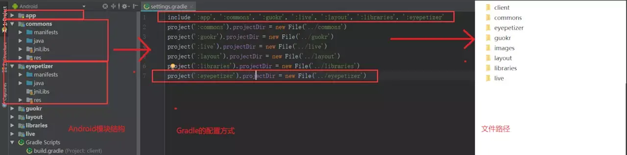 包结构 首先,我们先来看整个应用的包的结构。如下图所示,该模块的划分是根据各个模块的功能来决定的。图的右侧白色的部分是各个模块的文件路径,我推荐使用这种方式,而不是将各个模块放置在 app 下面,因为这样看起来更加的清晰。为了达到这个目的,你只需要按照下面的方式在 settings.gralde 里面配置一下各个模块的路径即可。注意在实际应用的时候模块的路径的关系,不要搞错了。