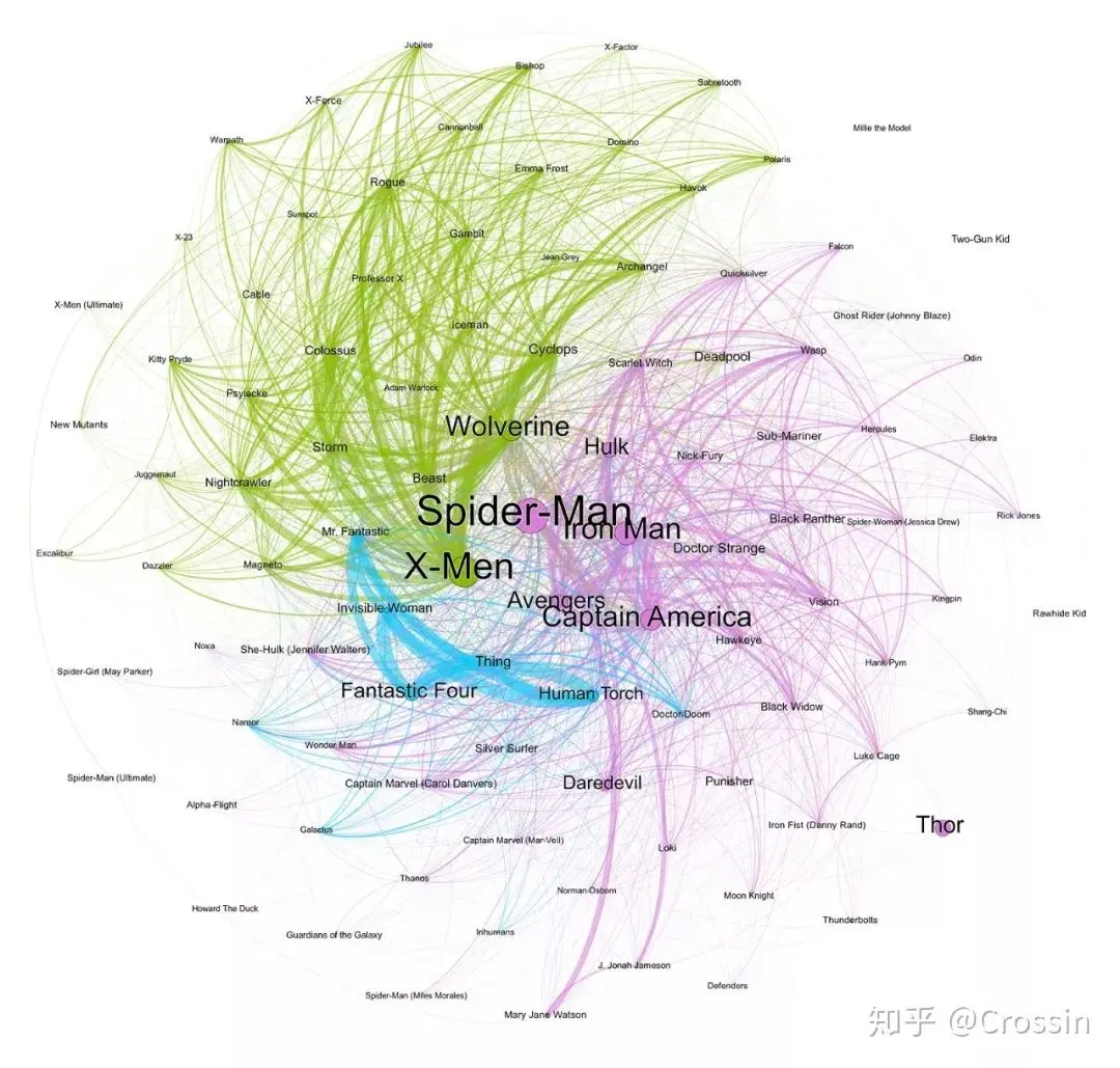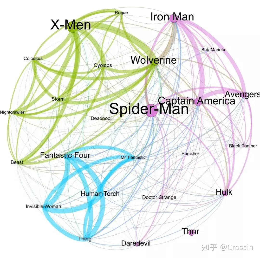 - 关系图上的颜色不是我们手动标注的,而是 Gephi 通过聚类自动划分的。文字标签的大小则体现故事数的多少。X战警、神奇四侠、复仇者联盟,这三个团体垄断了漫威绝大部分的故事。神奇四侠虽然人物和故事不算多,但相关关联很紧密(大多同时出场),相反典型是雷神(Thor),虽然故事很多,但大多独来独往。
