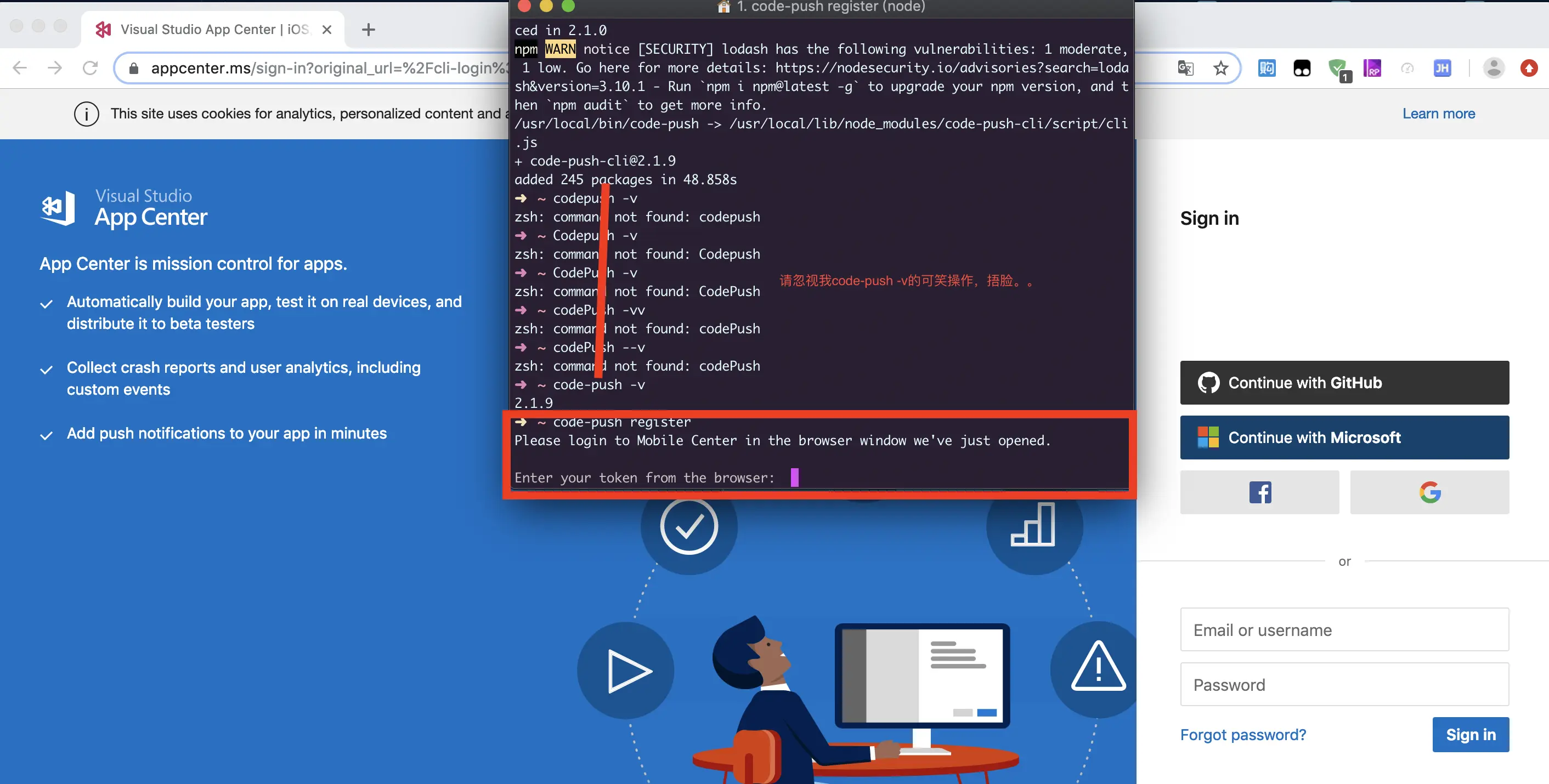 3.登录CodePush,浏览器会出现token