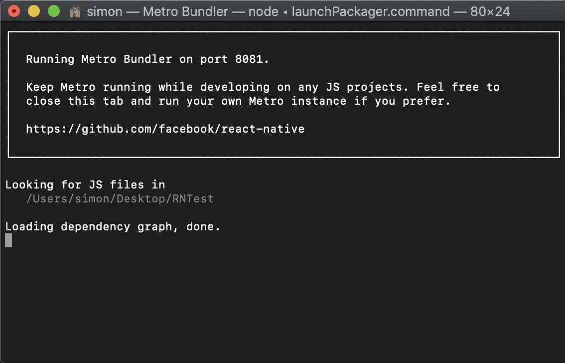 RNTest:项目的名称,ios:如果是安卓用android。成功后,如下图所示。