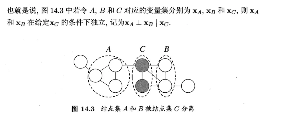 在马尔可夫随机场中,如何得到条件独立性呢?同样借助分离的概念,如下图中,若从结点集A的结点到结点集B中的结点,则必须经过结点集C中的结点,则称结点集A和B被结点集C分离,C称为分离集,对马尔可夫随机场,有: 全局马尔可夫性:给定两个变量子集的分离集,则这两个变量子集条件独立。