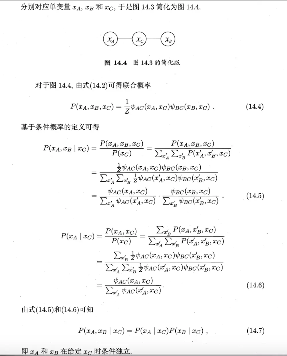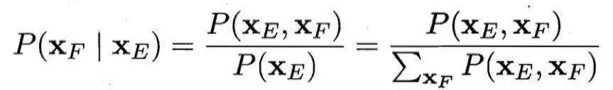 其中联合概率 P(x_E, x_F) 可基于概率图模型获得,因此,推断问题的关键就是如何高效的计算边际分布,即上式的分母部分。概率图模型的推断方法大致可以分为两类:第一类是精确推断方法,希望能计算出目标变量的边际分布或条件分布的精确值;遗憾的是,一般情况下,此类算法的计算复杂度随着极大团数量的增长呈指数增长,适用范围有限。第二类是近似推断方法,希望在较低的时间复杂度下获得原问题的近似解;此类方法在现实任务中更常见。本节介绍两种精确推断方法,下一节介绍近似推断方法。
