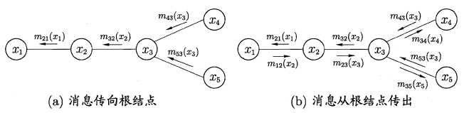 因此只需要经过下面两个步骤,便可以完成所有的消息传递过程。利用动态规划法的思想记录传递过程中的所有消息,当计算某个结点的边际概率分布时,只需直接取出传到该结点的消息即可,从而避免了计算多个边际分布时的冗余计算问题。