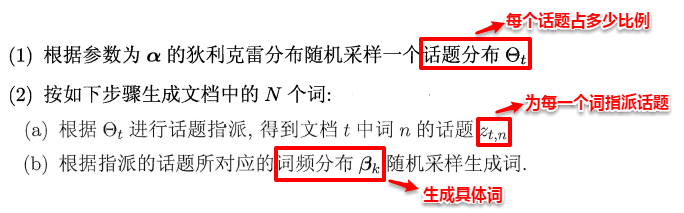 在现实任务中,一般我们可以得出一个文档的词频分布,但不知道该文档对应着哪些话题,LDA话题模型正是为了解决这个问题。具体来说:LDA认为每篇文档包含多个话题,且其中每一个词都对应着一个话题。因此可以假设文档是通过如下方式生成: