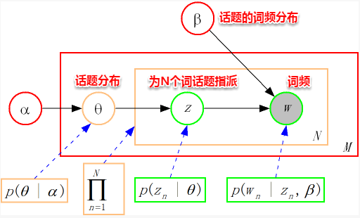 corpus-level(红色): α和β表示语料级别的参数,也就是每个文档都一样,因此生成过程只采样一次。 document-level(橙色): θ是文档级别的变量,每个文档对应一个θ。 word-level(绿色): z和w都是单词级别变量,z由θ生成,w由z和β共同生成,一个单词w对应一个主题z。