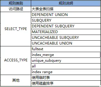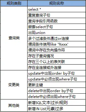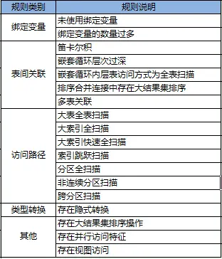 - 从审核对象角度来区分,规则可分为对象类、文本类、执行计划类和执行特征类。