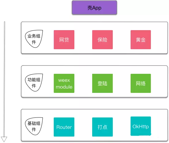 比较传统的一些架构是利用MVC、MVP、MVVM对项目进行分包,然而随着项目代码量越来越多,修改的时候会牵一发而动全身,而且不利于并行开发和回归测试。通过将一些通用的代码进行拆分,然后使用maven依赖进来,可以减少本地的代码量并解偶了一部分维护工作。随着业务的日渐复杂,aar级别的组件化还不够,每次修改部分业务都会需要对其他相关业务进行进行回归测试,一些当前版本不会用到的代码仍然会打包进APk,这样不利于后续的维护。所以业界相继提出了“组件化架构”的思想,也就是在整个Project层面对代码按照模业务块、功能模块、基础模块进行划分,然后在具体的Module中用MVC、MVP、MVVM等思想构建具体的代码。如下图所示: