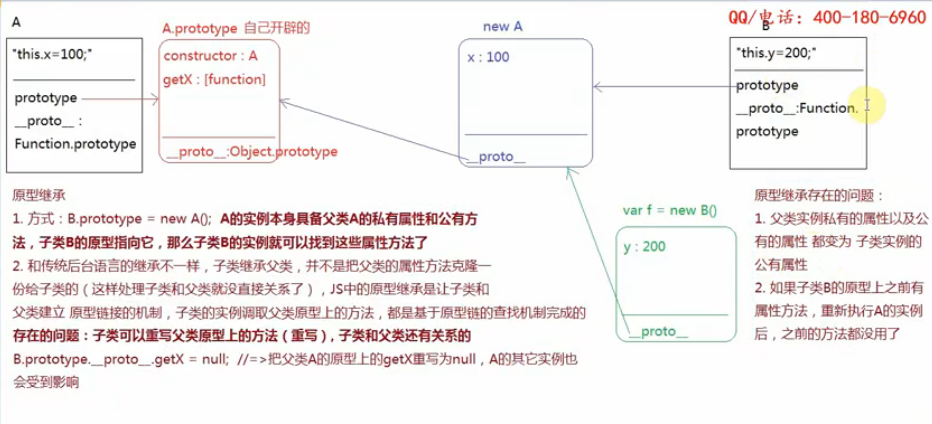 - 2.如果子类B的原型上之前有属性方法,重新执行A的实例后,之前的方法都没用了
