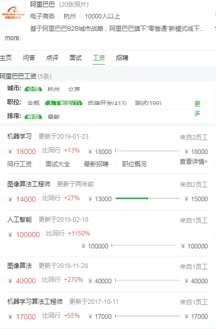 这是我一家招聘网上看到的阿里巴巴招聘工资,排在第一位的是人工智能,其次是图像算法(目前也挺火的),然后才是机械学习。可以看到人工智能的工资远远高于其他岗位,当然这基本上是985/211的毕业生,其他本科的待遇可能会差一点,不过基本保持在15K-20K之间吧,想想互联网其他岗位那个起薪有这么高。
