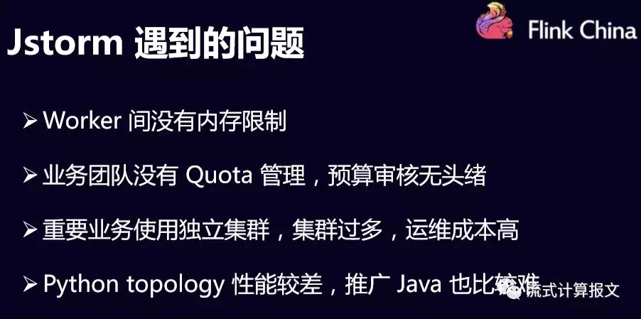 使用Jstorm集群遇到了什么问题呢?第一个问题,因为我们当时是用使用python写的代码,整个集群是没有内存隔离的,job和work之间是没有内存限制的。比如说在实际过程中会经常遇到一个用户,他可能代码写的有问题导致一个work可能占了70G内存,把机器的内存占了1/3。第二个问题就是说业务团队之间没有扩大管理,预算和审核是无头绪的。我们当时都是都是跑在一个大集群上面,然后个别业务是单独跑在一些小集群,但是我们每次都是资源不足,也没办法梳理这个预算。