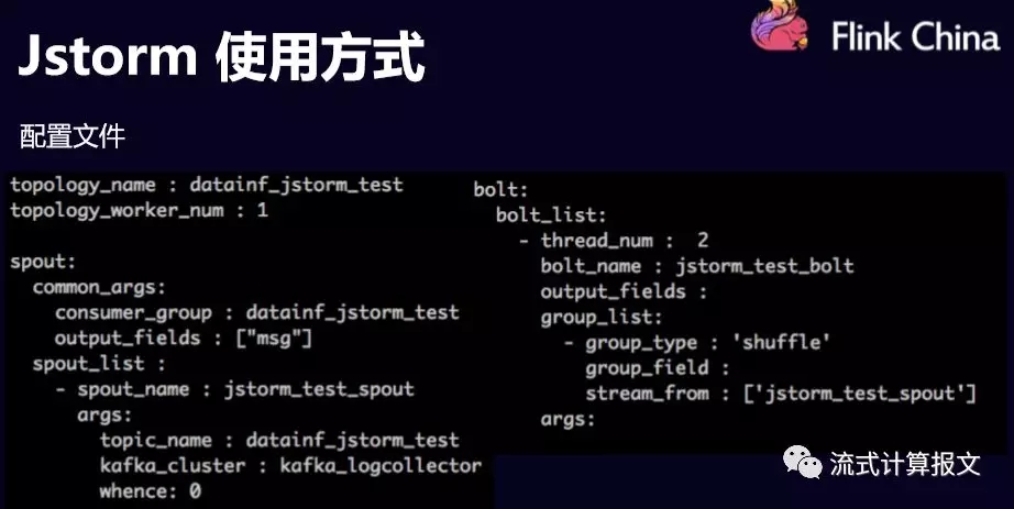 除了这些信息还有整个这个数据流的流转,比如说spout的输出,输出messsage的消息等等。最后还有整个的Spout到Bolt之间的shuffle逻辑。这就是我们之前Jstorm的整个使用方式。最后会把整个目录结构里面的内容去解析出来,根据配置文件把整个storm的拓扑结构构建出来,然后提交到集群上面去跑。