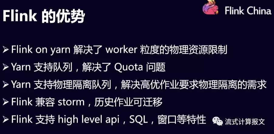 我们当时想解决上面的问题,一个思路是把Jstorm放在yarn上面,直接把Jstorm在yarn上面兼容做这一套。后来因为知道阿里在用Flink所以去调研Flink,发现了Flink的一些优势,所以想尝试用Flink解决存在的问题。