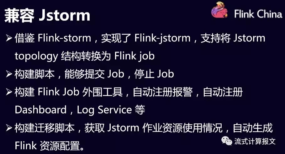 我们当时Flink用的是1.32版本,因为Flink有Flink-storm这个工程,它能把Storm作业转化成Flink作业,我们就借鉴这些技术上实现了一个Flink –jstorm。相当于把一个J storm的拓扑结构转化成了一个Flink job。只做完这件事情是不够的,因为我们有一系列的外围工具需要去对齐。比如说之前提交作业的时候是通过一个脚本提交的让用户去屏蔽一些其他的参数。使用 flink的话我们同样也是需要构建这么一个脚本,然后去提交Flink Job,最后停止flink Job。第三点是构建flink job外围工具,自动注册报警,比如说消费延迟报警,自动注册这个Dashboard以及一些log service,所有的这些为外围工具都要和原来的服务去对齐。
