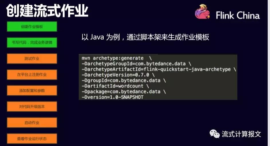第一步用户先要生成自己的一个作业模板,我们这边通过maven提供的脚本架去生成一些作业的schema,这个作业执行完之后,它会把帮你把一些porm文件,还有一些类似于kafkasource这种常规的组件都帮你准备好,然后你直接在这个模板里面填自己的主要逻辑就可以了。因为我们写Java程序遇到最多的一个问题就是包冲突问题。所以porm文件帮助用户把一些可能冲突的一些jar包都给以exclude掉,这样包冲突的概率会越来越小。