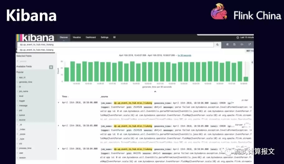 第一个是Flink UI,也就是官方自带的UI用户可以去看。第二个是Dashboard,我们展示了作业里面的task维度,QPS以及task之间的网络buffer,这些重要的信息汇聚到一起创建了一个Dashboard,这样可能查问题的时候方便一些。第三个是错误日志,其实和大家的思路一样,把一个分布式的日志然后聚合起来,然后写到ES上面去。第四是做了一个Jobtrace的工具,就是我们把Flink里面常见的一些异常匹配出来,然后直接给用户一个wiki的使用指南,告诉用户比如说你的作业OM了需要扩大内存。只要用户的作业出现了某些问题,我们把已知的所有的异常都会匹配给用户。 下面是ES的kibana: