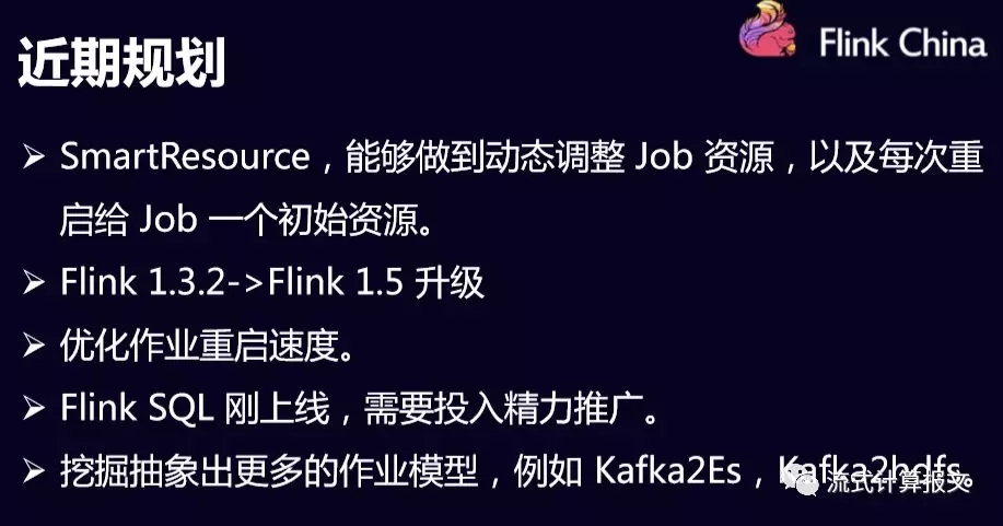 最后分享下我们的近期规划,前面的基本做完并且趋于稳定了,但是现在又遇到了一些新的问题。比如资源使用率这个问题,因为用户提交作业的时候,用户对资源不是特别敏感就随意把一个资源提上去了,可能他明明需要两个CPU,但是他提了四个CPU。我们想通过一个工具能够监控到他需要多少资源,然后通知yarn去把这个资源给重置了。就是动态调整job资源,自动把资源重置。