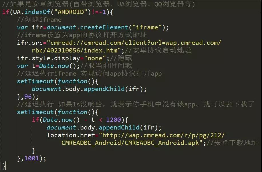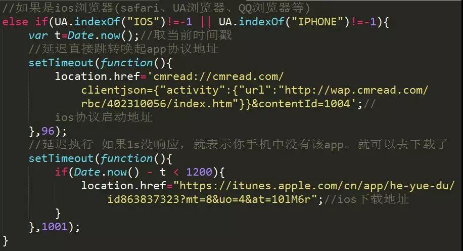 代码中的Data.now()-t <1200,只所以是1200,其实也是一个估计值,为了大部分解决一些已经安装的app,1秒后还是会跳转下载。因为打开app的瞬间,浏览器界面被app界面覆盖。但js未停止执行,延迟后还是会在后台打开下载页,只是被遮挡了。