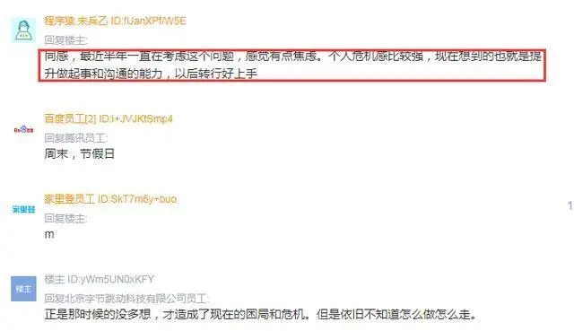 有网友就表示也是遇到了同样的中年危机。同样困境,是的。职业规划很重要,又是很多人根本没考虑过的。同感,最近半年一直在考虑这个问题,感觉有点焦虑。个人危机感比较强,现在想到的也就是提升做起事和沟通的能力,以后转行好上手。
