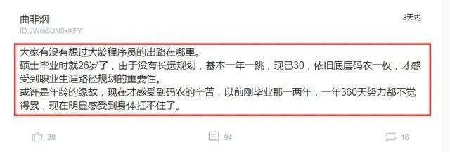 该位程序员大致意思是这样。**不知道各位职场人有没有想过大龄程序员的出路在哪里?**自己在硕士毕业时就已经26岁了,由于当时年轻也没有过多考虑,也没有给自己人生做长远规划,基本上每份工作都是一年一跳,现已30岁了,依旧还是最底层的码农一枚,如今而立之年才感受到职业生涯路径规划的重要性。或许是自己年龄的缘故,现在才感受到了码农的辛苦,刚毕业那一两年,一年360天努力都不觉得累,现在明显感受到身体扛不住了。而且脑子学习新东西的速度也明显下降,记忆力也慢慢不行了。