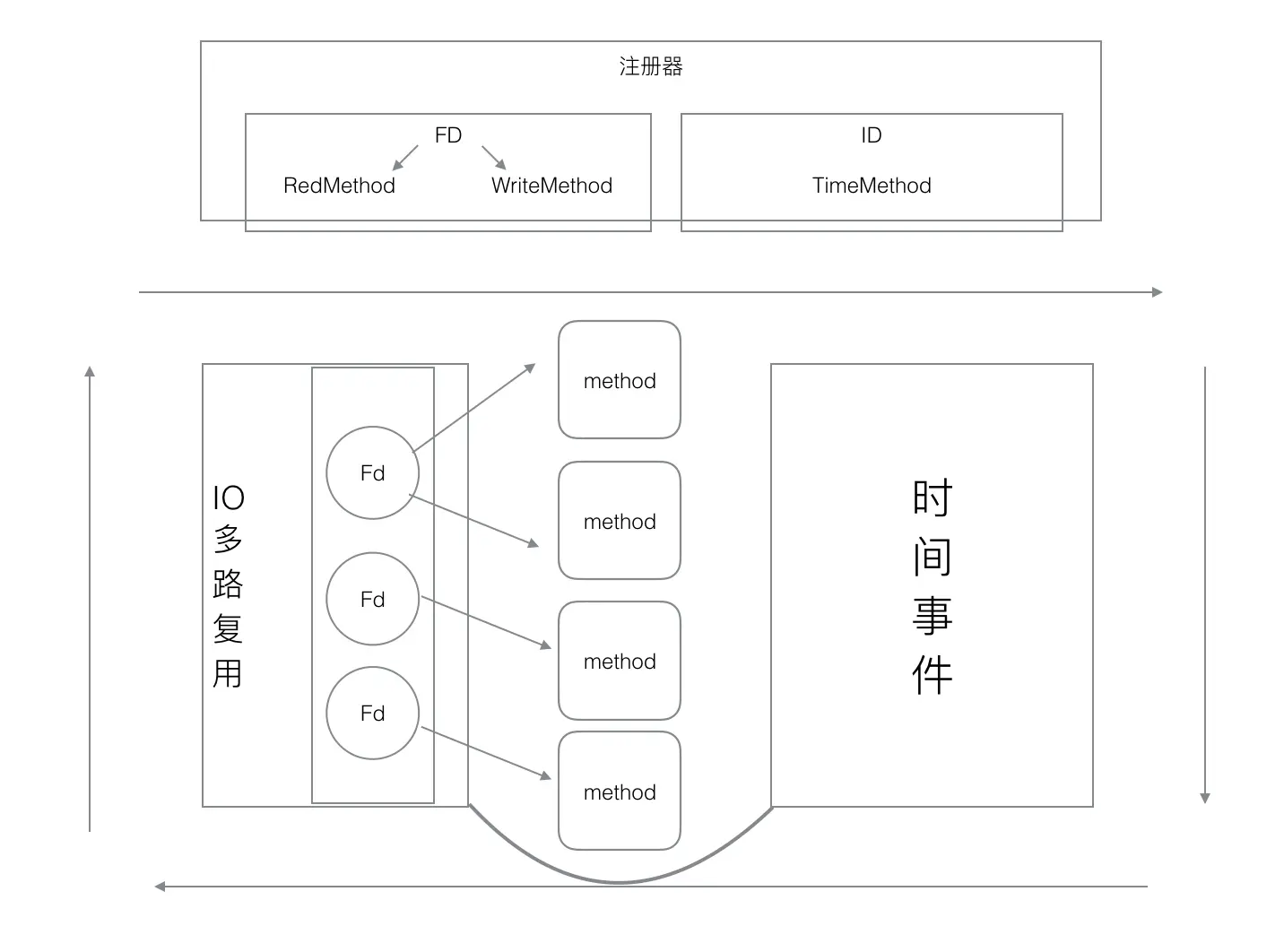 我们来看上图的注册器,注册器分为两部分 一部分是文件注册器,一部分是时间注册器,文件注册器将FD与读方法的函数指针和写方法的函数指针做了映射,当FD触发的时候 就可以根据读写标书去找到对应的方法来执行