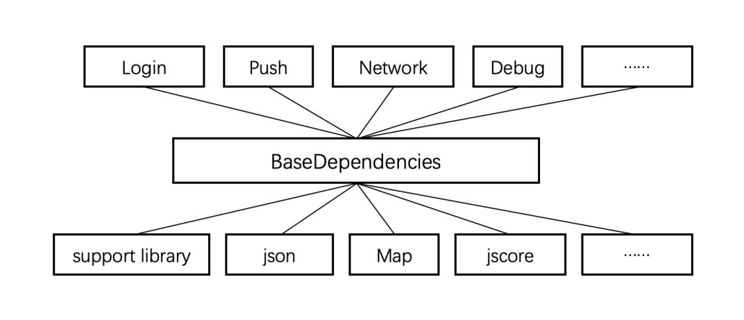 对于再基础点的组件,例如 Support Library、json 库等,绝大多数基础组件都会使用到。为了避免每个独立基础组件都去引入对应的依赖,还要尽可能得保证版本的统一,我们使用了一个空壳 Library 来一次性引入这些基础的依赖组件。