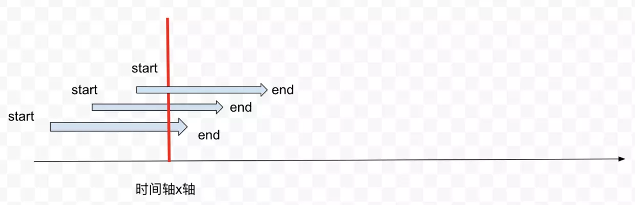 按照时间线来排序的话,我们会先后有三个会议,这三个会议的起始start以此排列,从此图的示例我们可以轻松的看出,同时会有三个会议进行。但是理由呢?理由是因为你看到了线段的重叠么?真正的理由是当三个start事件进入之后,我们的第一个end事件才进入。 所以,再对所有事件排序好之后,每当我们有一个start事件,会议室数量就需要+1,每当我们有一个end事件的时候,会议室数量就-1.因为end代表一个会议结束,因此所需要的会议室数量可以减少。