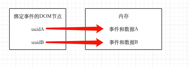 jQuery 采用数据分离的方法来保存 DOM 上的事件和数据,利用 uuid 标记每个 DOM 元素,然后在内存上,将每个 DOM 元素相关的数据放到内存中,然后在 uuid 和内存的数据之间建立映射。