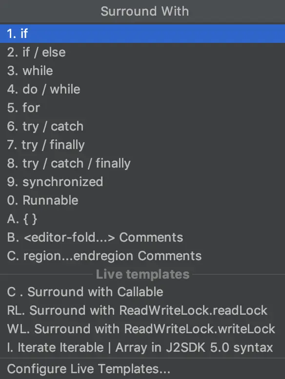 cmd + option + T(使用if..else, try..catch, for, synchronized等包围选中的代码)