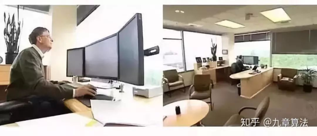 比尔·盖茨的电脑桌非常简约,最特色的是并排的三台显示器,大屏、多屏算是IT控们的最爱吧! 在比尔盖茨面前,显示器都不敢亮,大师编程果然就是不一样。 话说,比尔盖茨貌似在看窗外、发呆耶!