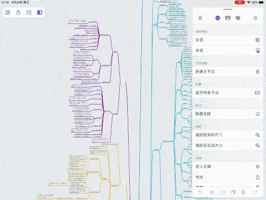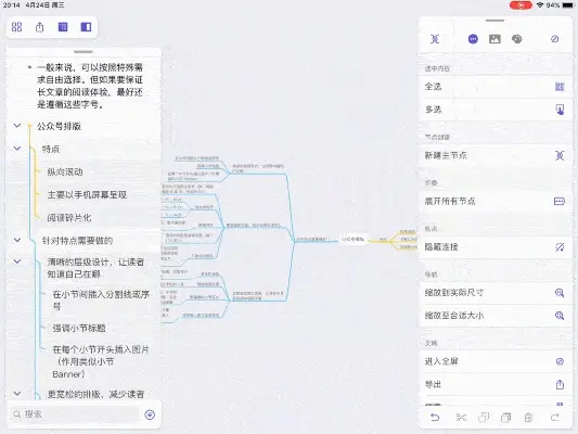 如果你想切换焦点,也可以直接点击其他节点,并选择「取消焦点」即可。在焦点模式下,淡化效果还会随着缩放而变化。MindNode 也提供了手势操作来快速进入焦点模式,选中需要聚焦的节点后,三指向上滑动即可。在焦点模式中,三指向上滑动也可以快速退出。