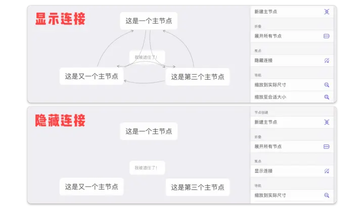 此次更新加入的「隐藏连接」功能,可以一键隐藏连接线。在工具面板中,你可以看到「隐藏连接」的选项,轻按即可隐藏所有连接线。再次点击就能恢复显示。