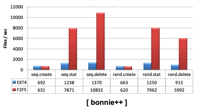 而在文件系统上下手则可以说是从根本上进行优化了。早在 2012 年,三星等厂商就推出了 F2FS 文件系统,其专门为闪存芯片而设计,相较诞生于机械硬盘时代的 EXT4 文件系统,在随机读写——尤其是写入时,有着压倒性的性能优势。对于智能手机而言,这无疑是重大利好。