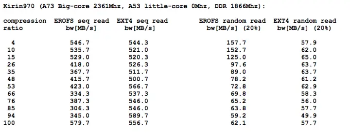 其次,提升的随机读取速度也让系统响应速度的提升成为了可能。在发布之初,华为的工程师就在麒麟 970 上进行过测试,测试结果显示,相较 EXT4,超级文件系统能提供最多翻倍的性能优势;这种优势在小压缩率下尤为明显,而即便是 100% 压缩,表现也有提升。