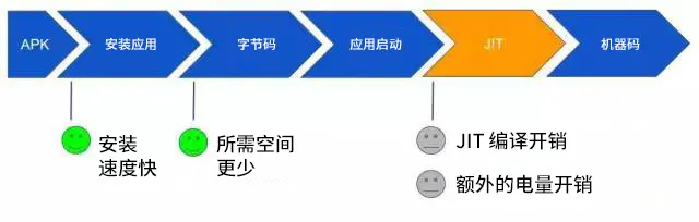 这样每次打开应用都会直接执行机器码,运行时省掉了编译过程;不仅打开应用的速度更快,用起来也更流畅,同时由于不需要实时编译,运算压力降低,还起到了省电的功效。
